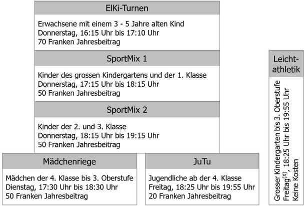 Der SportMix und das JuTu starten in der ersten Schulwoche. In der zweiten Woche legt dann die Mädchenriege los. Das ElKi-Turnen beginnt nach den Herbstferien. Du darfst gerne ein paar Mal vorbeikommen und ausprobieren, ob dir die Turnstunden gefallen. Falls du lieber in einer anderen Altersgruppe mitmachen möchtest, dann teile uns das bitte mit. Wir probieren dann, deinen Wunsch zu erfüllen.